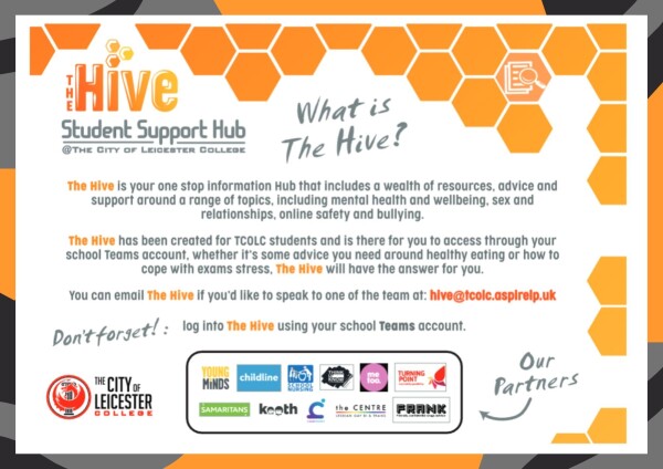 The Hive is a one stop information Hub that includes a wealth of resources, advice and support. Students can log into The Hive using their school Teams account or can email The Hive if they'd like to speak to one of the team at: hive@tcolc.aspirelp.uk